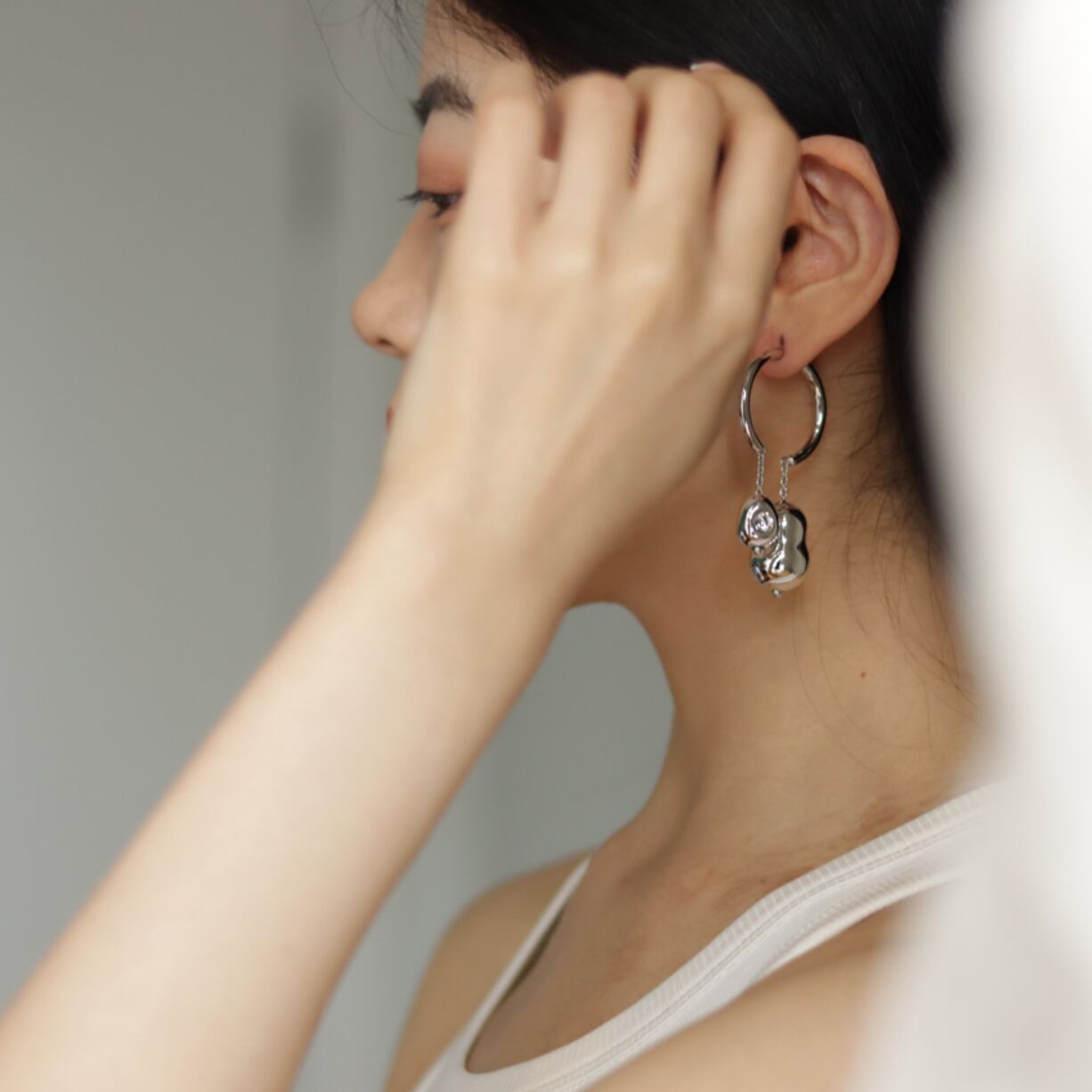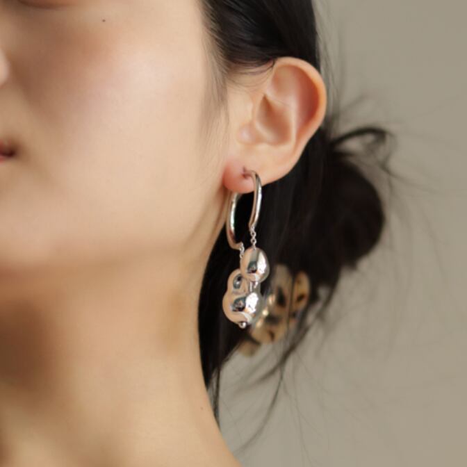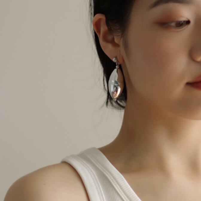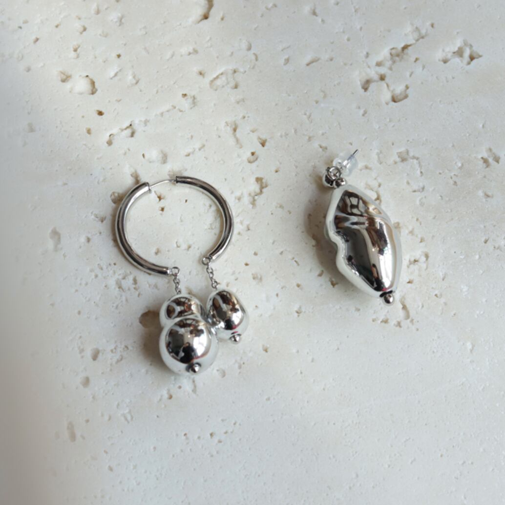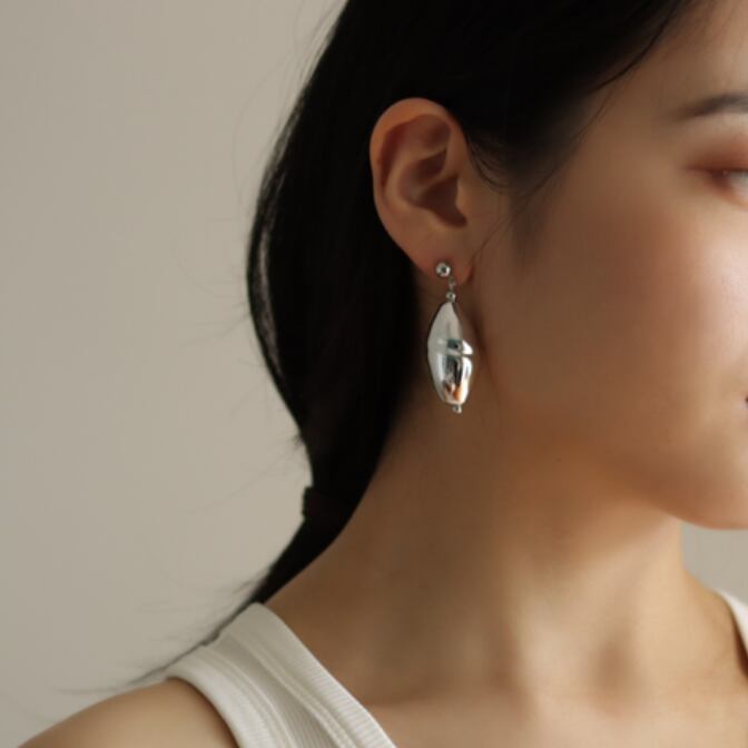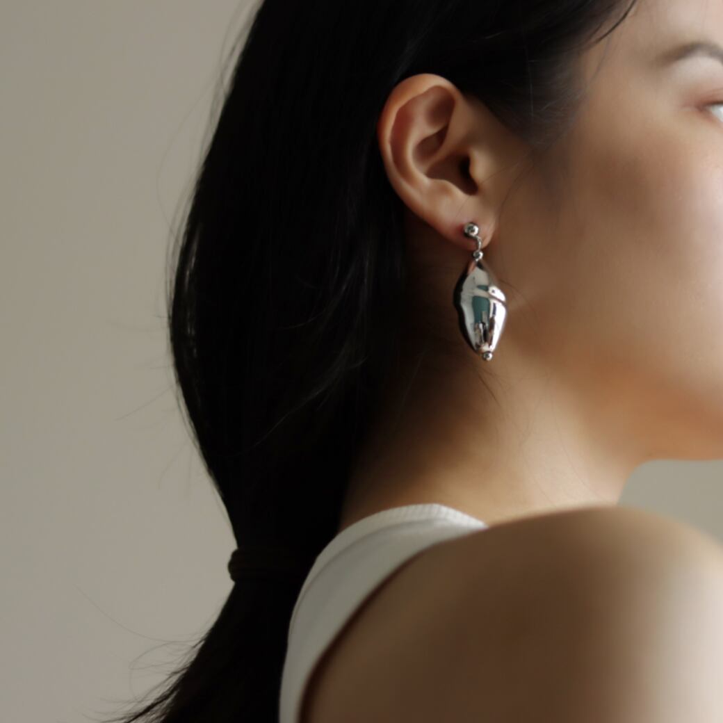 特殊ガラス素材に、銀メッキを施したオリジナルアシメントリーピアス。